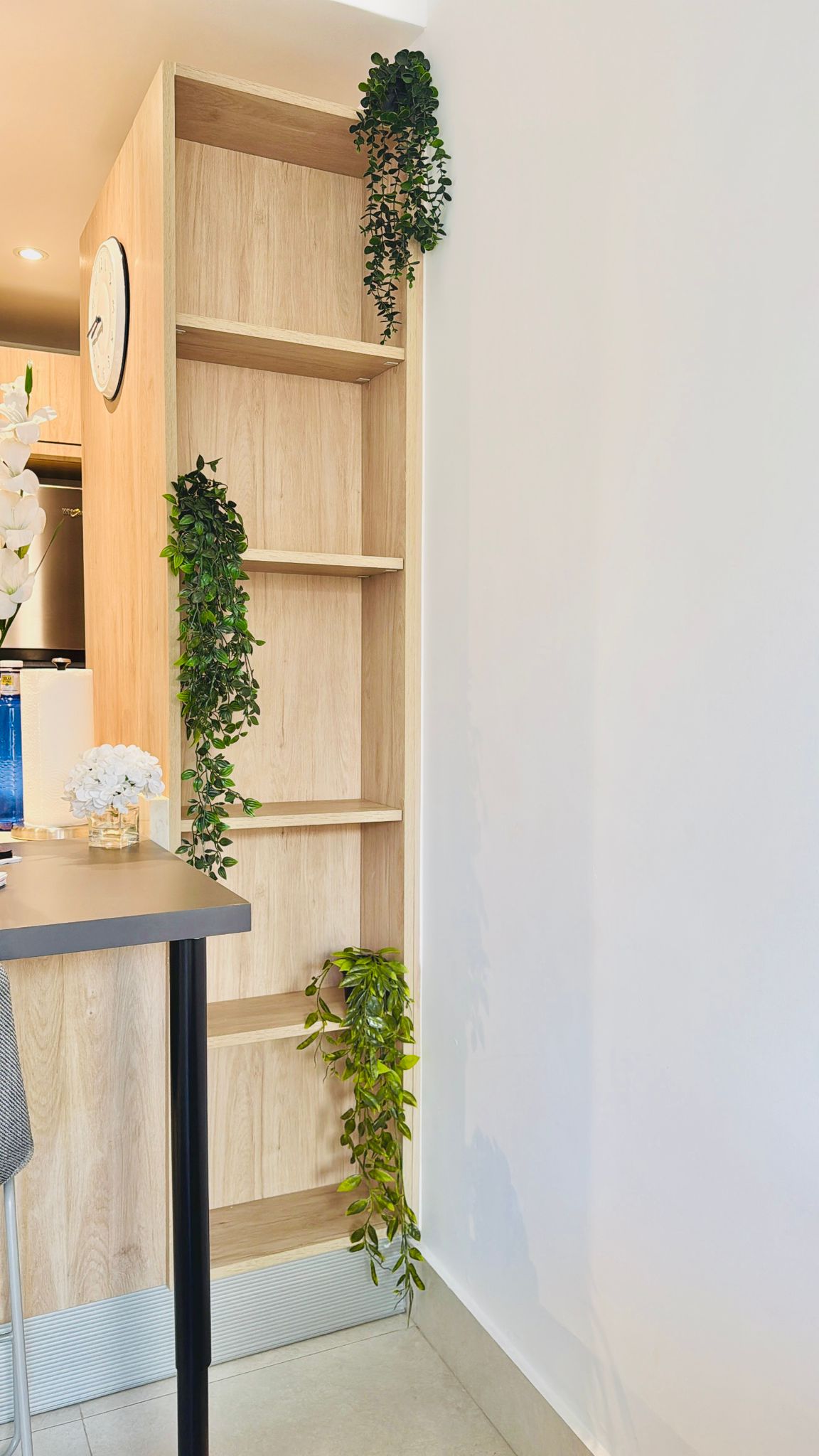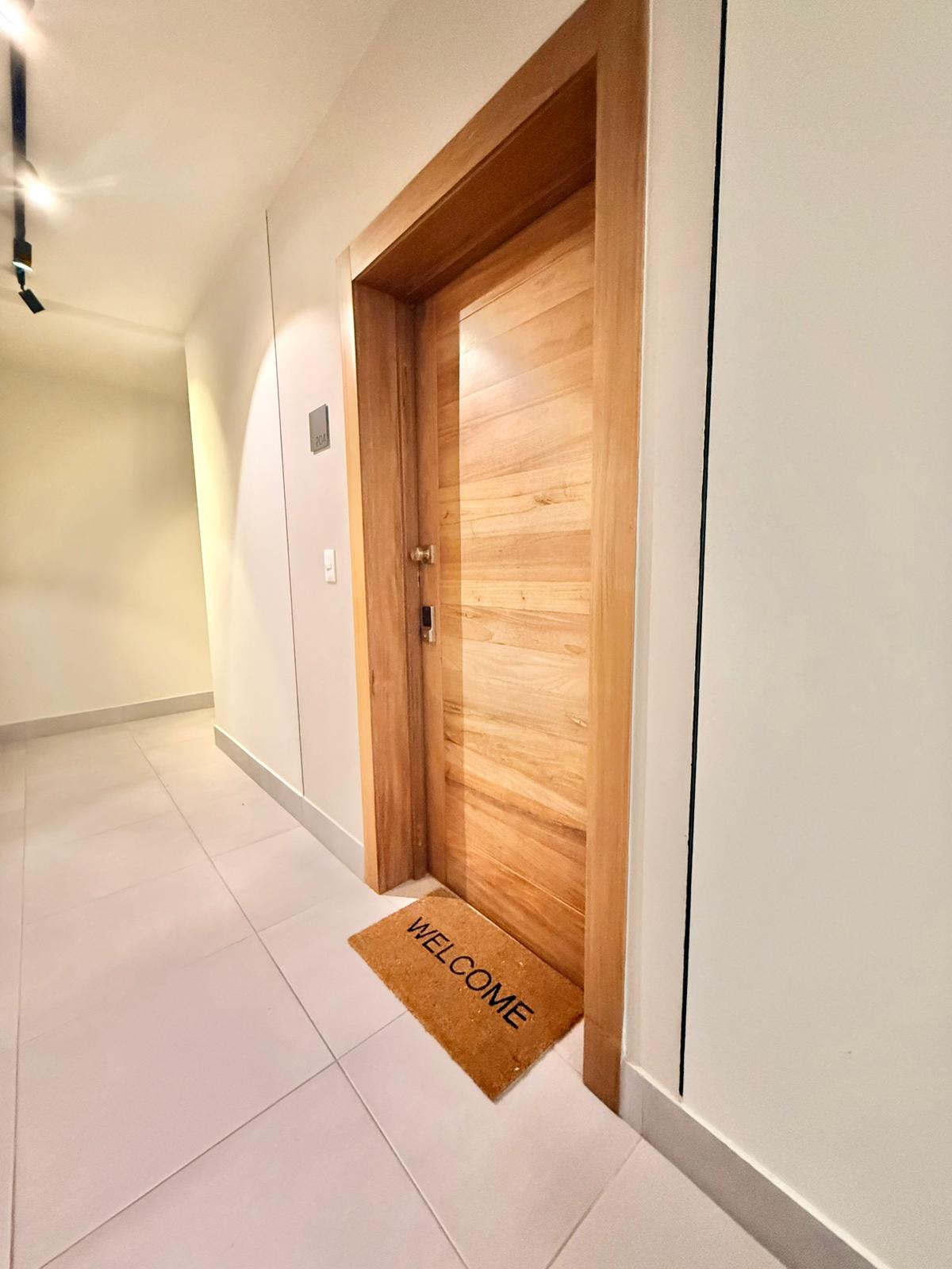 The finishes are high-quality: imported porcelain tile floors, a modular kitchen with granite countertops, a plaster-clad ceiling, and precious wood doors, among others.