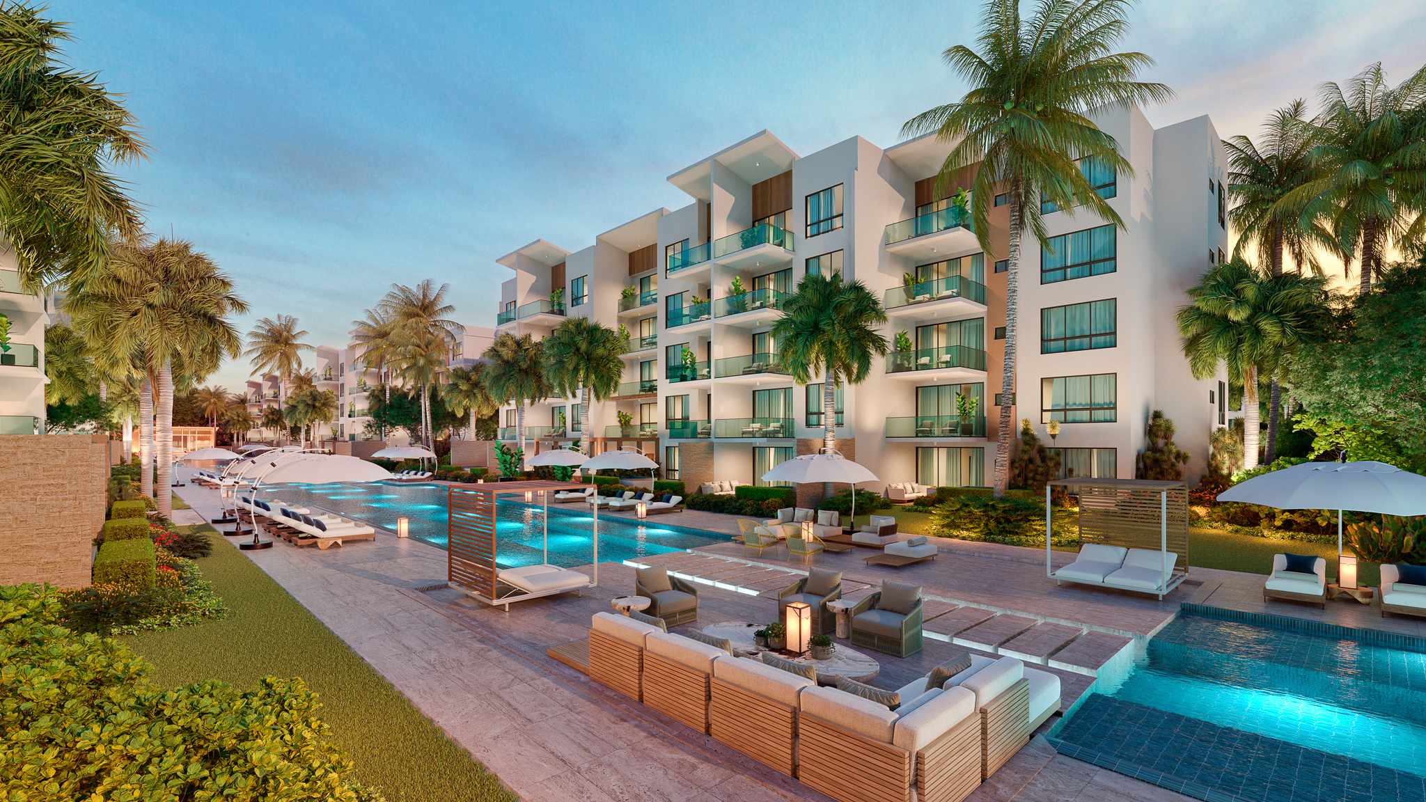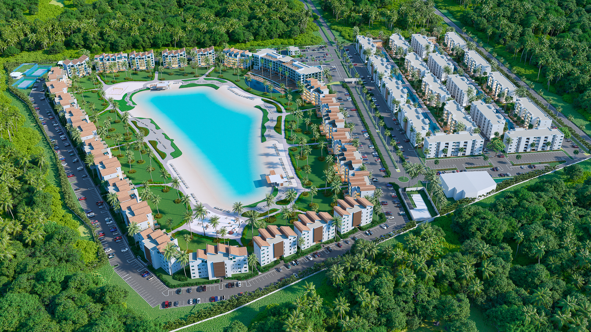 New Construction Punta Cana apartments For Sale located in  Downtown Punta Cana with artificial lake-views at The Beach at Punta Cana City Place